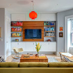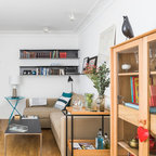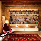 バルセロナの大きいインダストリアルスタイルのおしゃれなファミリールーム (ライブラリー、オレンジの壁、コンクリートの床、暖炉なし、テレビなし) の写真 — Houzz
