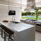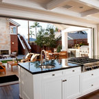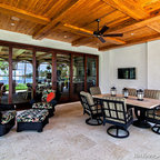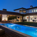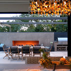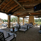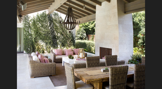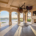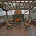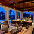 サンディエゴの大きい地中海スタイルのおしゃれな裏庭のテラス (タイル敷き、張り出し屋根、ファイヤーピット) の写真 — Houzz