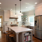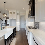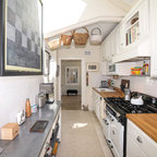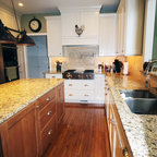 ボストンの中サイズのカントリー風おしゃれなキッチン (アンダーカウンターシンク、レイズドパネル扉のキャビネット、中間色木目調キャビネット、御影石カウンター、グレーのキッチンパネル、セラミックタイルのキッチンパネル、シルバーの調理設備、淡色無垢フローリング) の写真 — Houzz