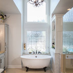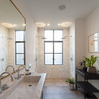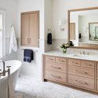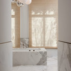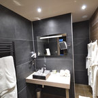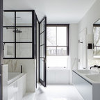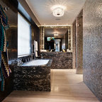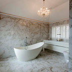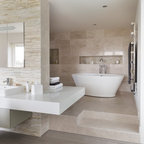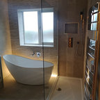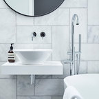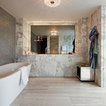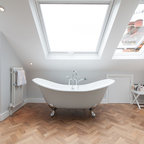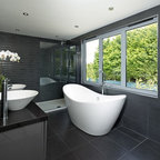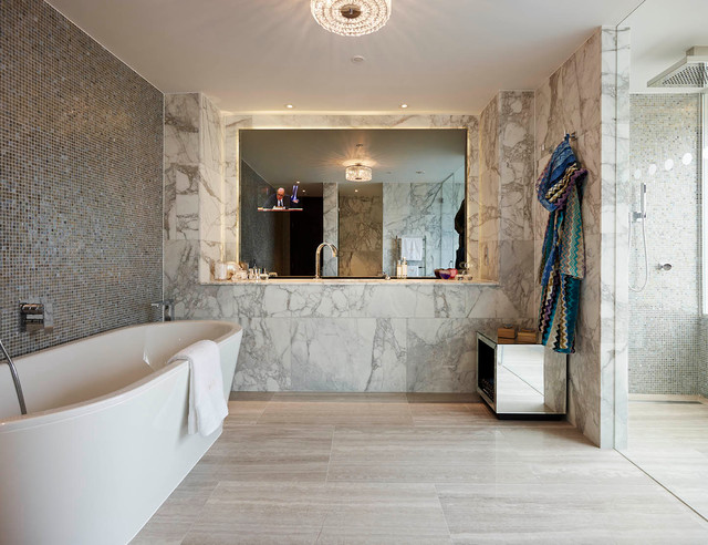 ロンドンのコンテンポラリースタイルのおしゃれな浴室 (置き型浴槽、グレーのタイル) の写真 — Houzz