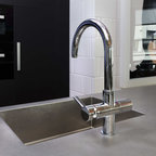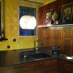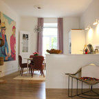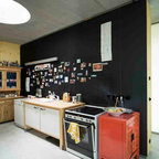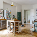 ベルリンの広いエクレクティックスタイルのおしゃれなキッチン (シルバーの調理設備、無垢フローリング、フラットパネル扉のキャビネット、グレーのキャビネット、グレーのキッチンパネル、シングルシンク) の写真 — Houzz