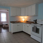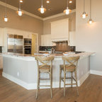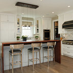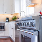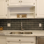 ルイビルのトランジショナルスタイルのおしゃれなキッチン (落し込みパネル扉のキャビネット、白いキャビネット、グレーのキッチンパネル、ボーダータイルのキッチンパネル、シルバーの調理設備、無垢フローリング) の写真 — Houzz