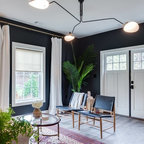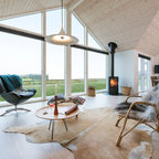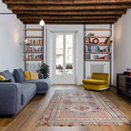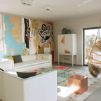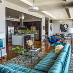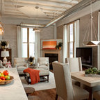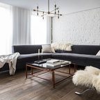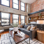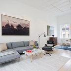 ニューヨークの巨大な北欧スタイルのおしゃれなLDK (フォーマル、グレーの壁、コンクリートの床、暖炉なし) の写真 — Houzz