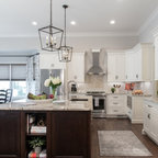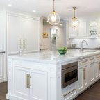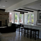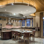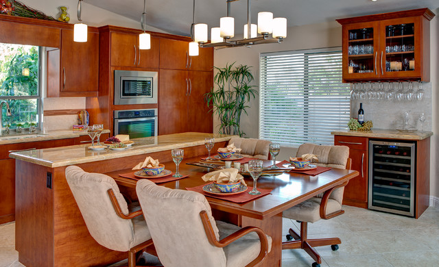 A luxurious kitchen transformation for a 90's built house. Walls were removed to create an open living concept from kitchen, dining to family room. Top level appliances were set in place for optimum function, including a microwave drawer at the island. A connecting table top, over a useable cabinet, to a beautiful counter top of Brazilian Quartzite adds to the functionality as well as aesthetics. Vaulted ceilings give way to plentiful lighting for the home chef as well as family dining. A wine and beverage center round out the possibilities.