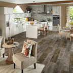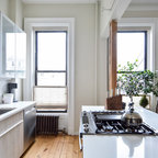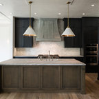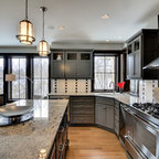ラスベガスの中くらいのトランジショナルスタイルのおしゃれなキッチン (フラットパネル扉のキャビネット、中間色木目調キャビネット、御影石カウンター、ベージュキッチンパネル、石タイルのキッチンパネル、シルバーの調理設備) の写真 — Houzz
