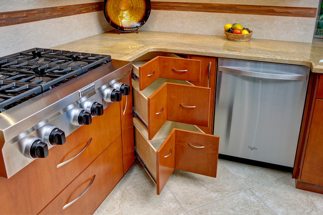 A corner cabinet with function and efficiency! How perfect is that? These corner drawers far outweigh any other solution for a hard to deal with corner space. Room Resolutions made it easy! Photography by Victor Bernard