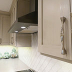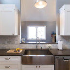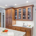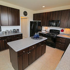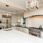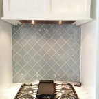 ラスベガスの中くらいのトランジショナルスタイルのおしゃれなキッチン (フラットパネル扉のキャビネット、中間色木目調キャビネット、御影石カウンター、ベージュキッチンパネル、石タイルのキッチンパネル、シルバーの調理設備、磁器タイルの床) の写真 — Houzz