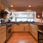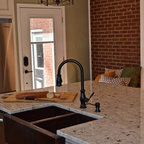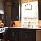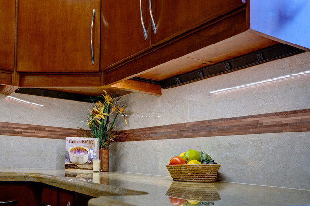 A brilliant way to light countertops! Under cabinet lighting that hides from view and brings direct light where it is needed in the kitchen. Under cabinet angled receptacles are installed for convenience in the kitchen. The metal backsplash creates a smooth, sleek look.