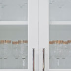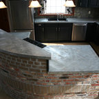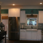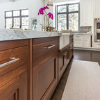 A 90's kitchen gets a lift featuring a table extension from the island with storage beneath.