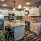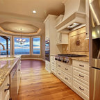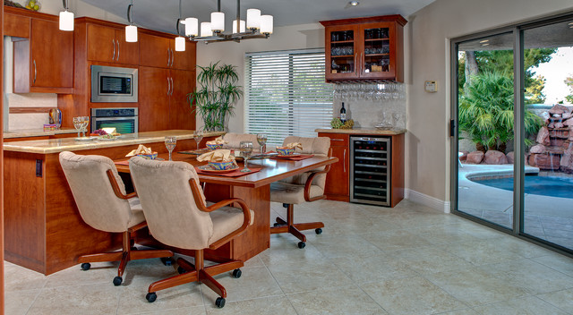 ラスベガスの中くらいのトランジショナルスタイルのおしゃれなキッチン (アンダーカウンターシンク、フラットパネル扉のキャビネット、中間色木目調キャビネット、御影石カウンター、ベージュキッチンパネル、石タイルのキッチンパネル、シルバーの調理設備、磁器タイルの床) の写真 — Houzz