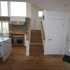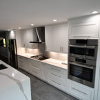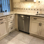 ラスベガスの中くらいのトランジショナルスタイルのおしゃれなキッチン (ダブルシンク、フラットパネル扉のキャビネット、中間色木目調キャビネット、御影石カウンター、ベージュキッチンパネル、石スラブのキッチンパネル、シルバーの調理設備、磁器タイルの床) の写真 — Houzz