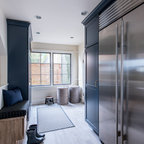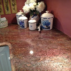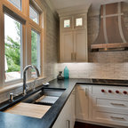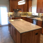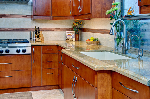 ラスベガスの中くらいのトランジショナルスタイルのおしゃれなキッチン (アンダーカウンターシンク、フラットパネル扉のキャビネット、中間色木目調キャビネット、御影石カウンター、ベージュキッチンパネル、石スラブのキッチンパネル、シルバーの調理設備、磁器タイルの床) の写真 — Houzz