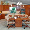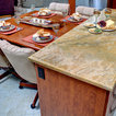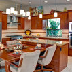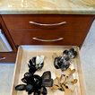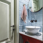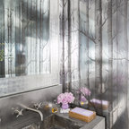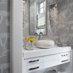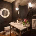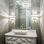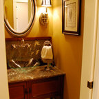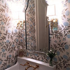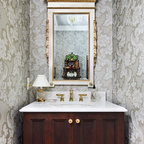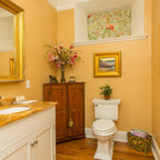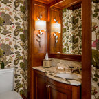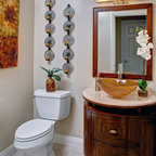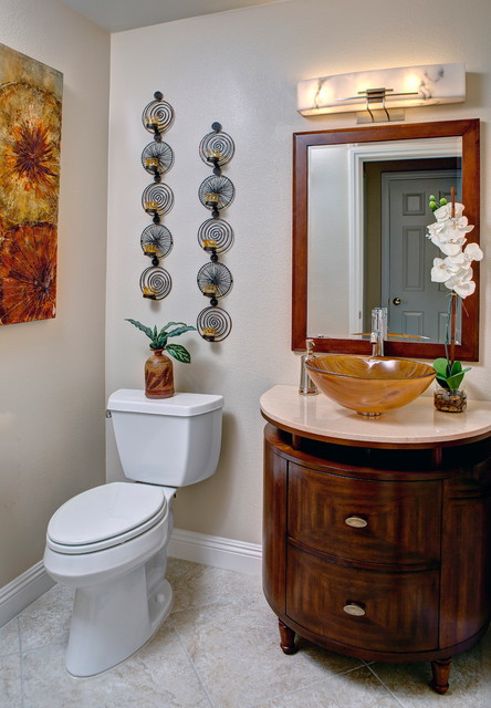 Powder Bathroom with rounded-front vanity and Asian touches.