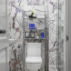 ラスベガスのトラディショナルスタイルのおしゃれなトイレ・洗面所 (ベッセル式洗面器、フラットパネル扉のキャビネット、濃色木目調キャビネット、御影石の洗面台、分離型トイレ、ベージュの壁、磁器タイルの床) の写真 — Houzz