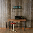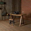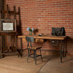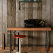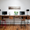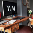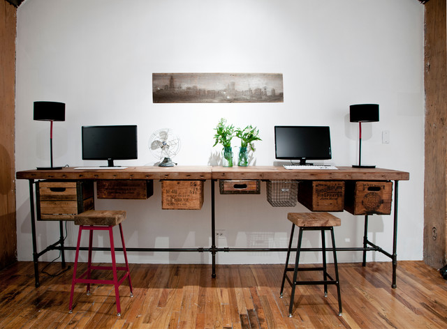 5. 再生材を利用したデスクパイプ、再生材、ヴィンテージの木箱を組み合わせてつくった、世界にひとつだけのダブルデスク。引き出し用の取り付け金具を使えば、古いケースや木箱も機能的な引き出しに生まれ変わります。