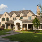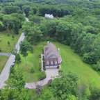 view of back of house, stone patio, add fireplace to back left side. Add windows to enclosed arch from interior, enclose to regular windows with black trim Door to back right going out to patio.