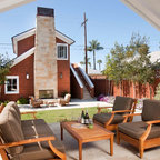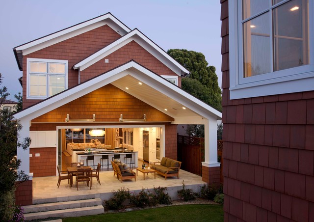 サンディエゴのトラディショナルスタイルのおしゃれな家の外観 (木材サイディング、茶色い外壁、切妻屋根、戸建、板屋根) の写真 — Houzz