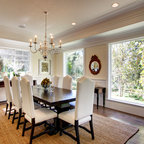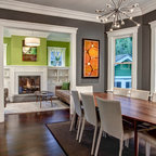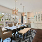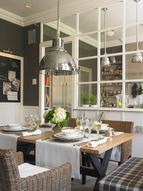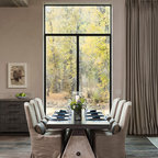 Great wall of windows separating kitchen fro eating area.