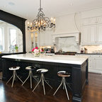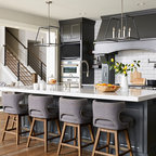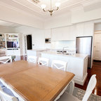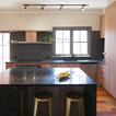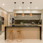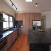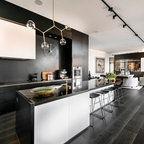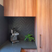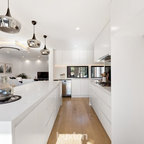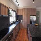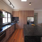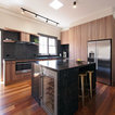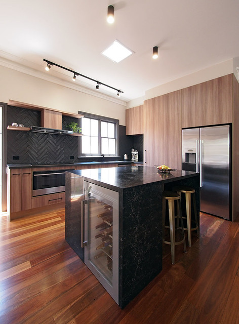 メルボルンの中サイズのコンテンポラリースタイルのおしゃれなキッチン (ダブルシンク、中間色木目調キャビネット、クオーツストーンカウンター、黒いキッチンパネル、セラミックタイルのキッチンパネル、黒い調理設備、無垢フローリング) の写真 — Houzz