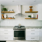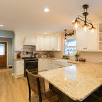 ブリッジポートの中サイズのカントリー風おしゃれなキッチン (エプロンフロントシンク、レイズドパネル扉のキャビネット、茶色いキャビネット、クオーツストーンカウンター、シルバーの調理設備、無垢フローリング、茶色い床) の写真 — Houzz