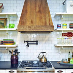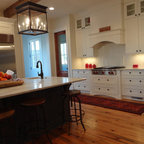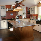 This cozy and functional kitchen is perfect for a renovated posta nd beam barn. The Wood-Mode and Brookhaven cabinetry in a barn red paint with rub off and distressed cherry add to the loosely fitted look.