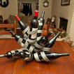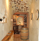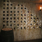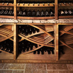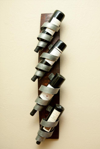 Chris's Curls Wall-Mounted Wine Rack. Handmade from reclaimed Napa Valley wine barrels. Wood comes from the barrel stave. Tapered steel curls are pulled from the steel bands from the same barrels. Made in the USA.