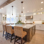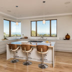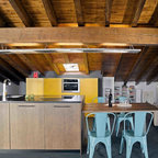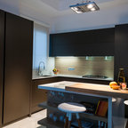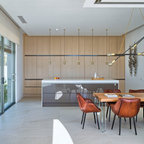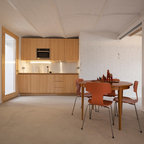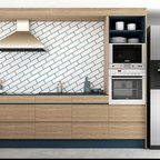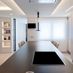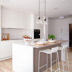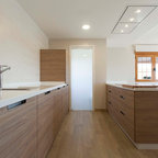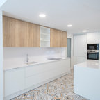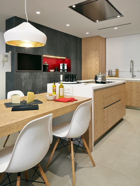 バルセロナの中くらいのコンテンポラリースタイルのおしゃれなキッチン (フラットパネル扉のキャビネット、淡色木目調キャビネット、一体型シンク、白いキッチンパネル、シルバーの調理設備、セラミックタイルの床) の写真 — Houzz