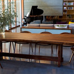 We've had many favoutires over the years, but this one speaks for it self. A live Edge Claro Walnut Dining Table, single slab with a custom trestle style base.