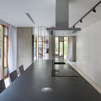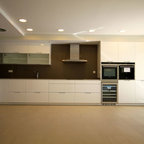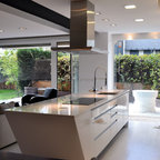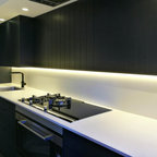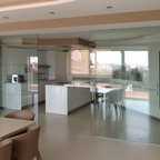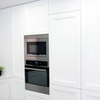 セビリアの小さいモダンスタイルのおしゃれなキッチン (フラットパネル扉のキャビネット、アンダーカウンターシンク、白いキャビネット、クオーツストーンカウンター、グレーのキッチンパネル、シルバーの調理設備、無垢フローリング) の写真 — Houzz