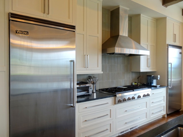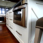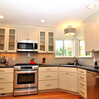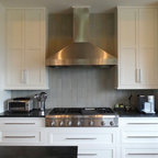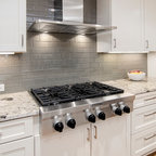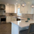 シャーロットの巨大なコンテンポラリースタイルのおしゃれなキッチン (ダブルシンク、シェーカースタイル扉のキャビネット、白いキャビネット、御影石カウンター、グレーのキッチンパネル、ボーダータイルのキッチンパネル、シルバーの調理設備の、無垢フローリング) の写真 — Houzz