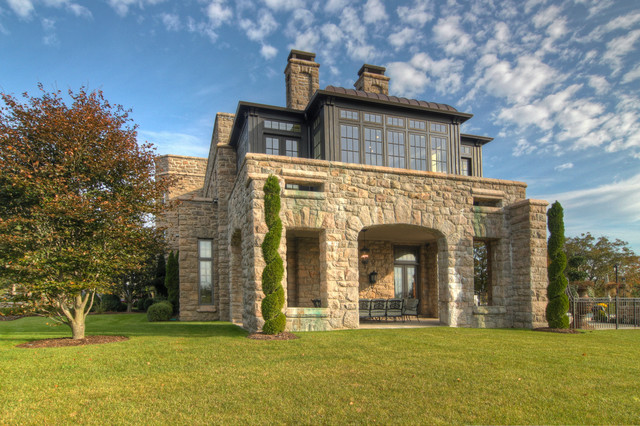 ニューヨークのトラディショナルスタイルのおしゃれな二階建ての家 (石材サイディング) の写真 — Houzz