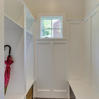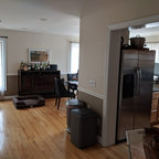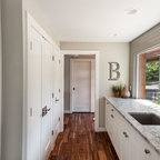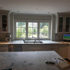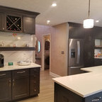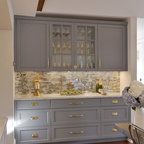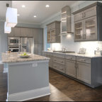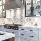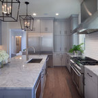 セントルイスの中サイズのトランジショナルスタイルのおしゃれなキッチン (アンダーカウンターシンク、落し込みパネル扉のキャビネット、グレーのキャビネット、御影石カウンター、ベージュキッチンパネル、磁器タイルのキッチンパネル、シルバーの調理設備、セラミックタイルの床、グレーの床) の写真 — Houzz