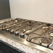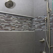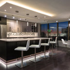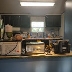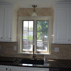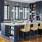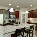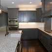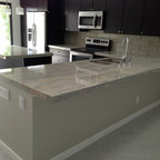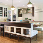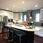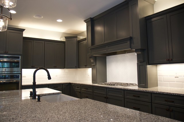 ミルウォーキーの広いトランジショナルスタイルのおしゃれなキッチン (エプロンフロントシンク、フラットパネル扉のキャビネット、グレーのキャビネット、御影石カウンター、白いキッチンパネル、サブウェイタイルのキッチンパネル、シルバーの調理設備、濃色無垢フローリング) の写真 — Houzz