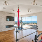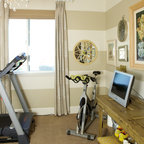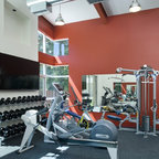 gym. mirrored wall with flatscreen. room for two bikes, treadmill, weights