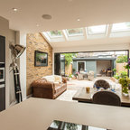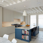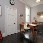 エディンバラのエクレクティックスタイルのおしゃれなキッチン (落し込みパネル扉のキャビネット、白いキャビネット、ミラータイルのキッチンパネル、淡色無垢フローリング) の写真 — Houzz