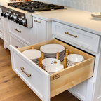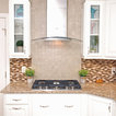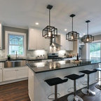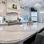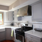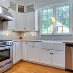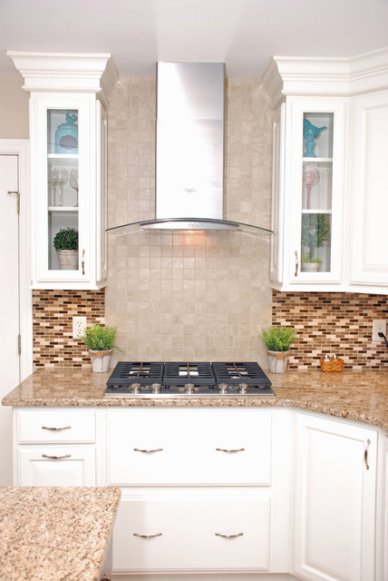 フィラデルフィアの中くらいのトランジショナルスタイルのおしゃれなキッチン (アンダーカウンターシンク、レイズドパネル扉のキャビネット、白いキャビネット、御影石カウンター、マルチカラーのキッチンパネル、モザイクタイルのキッチンパネル、シルバーの調理設備、クッションフロア) の写真 — Houzz