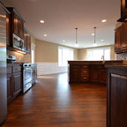 The simple lines of Denali and Hilton come together for a sensible approach to modern style; designed to complement today's busy lifestyle. Denali's textured surface offers rich dimensional flair, while Hilton adds a touch of glimmer with a reflective gloss surface. Both finishes come together on the island as a design focal point offering seating, a second sink and generous storage.
