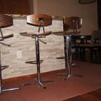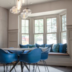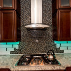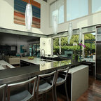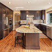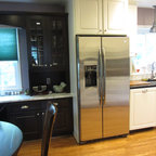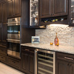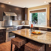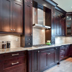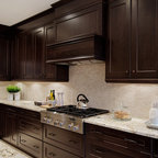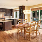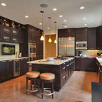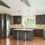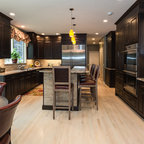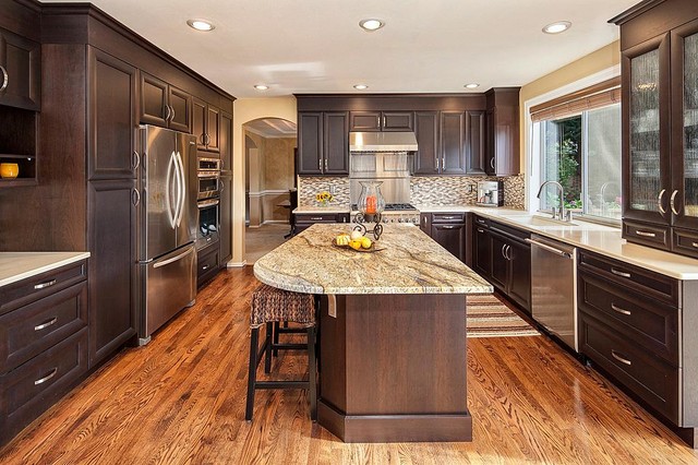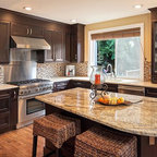 シアトルの大きいコンテンポラリースタイルのおしゃれなキッチン (ドロップインシンク、落し込みパネル扉のキャビネット、濃色木目調キャビネット、御影石カウンター、ベージュキッチンパネル、ボーダータイルのキッチンパネル、シルバーの調理設備の、無垢フローリング) の写真 — Houzz
