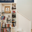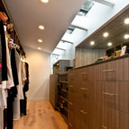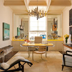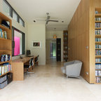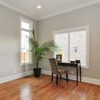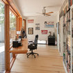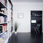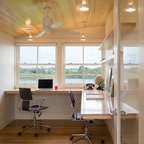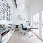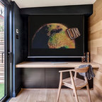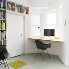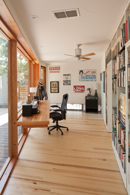 オースティンのコンテンポラリースタイルのおしゃれなホームオフィス・仕事部屋 (白い壁、無垢フローリング、造り付け机) の写真 — Houzz