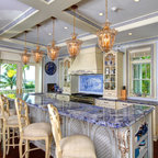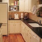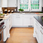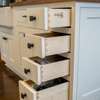 フェニックスの大きいカントリー風おしゃれなキッチン (エプロンフロントシンク、レイズドパネル扉のキャビネット、グレーのキャビネット、大理石カウンター、ベージュキッチンパネル、石タイルのキッチンパネル、シルバーの調理設備、磁器タイルの床、グレーの床) の写真 — Houzz
