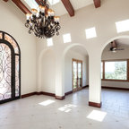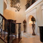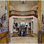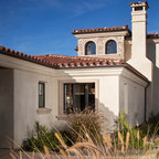 Inspired by European villas, the palette for this home utilizes natural earth tones, along with molded eaves, precast columns, and stone veneer. The design takes full advantage of natural valley view corridors as well as negating the line between interior and exterior living. The use of windows and French doors allows virtually every room in the residence to open up onto the spacious pool courtyard. This allows for an extension of the indoor activities to the exterior.