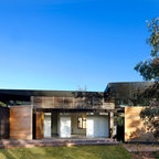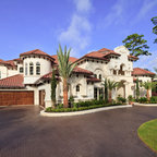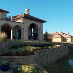 Inspired by European villas, the palette for this home utilizes natural earth tones, along with molded eaves, precast columns, and stone veneer. The design takes full advantage of natural valley view corridors as well as negating the line between interior and exterior living. The use of windows and French doors allows virtually every room in the residence to open up onto the spacious pool courtyard. This allows for an extension of the indoor activities to the exterior.