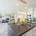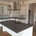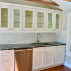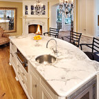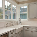 ローリーのトランジショナルスタイルのおしゃれなキッチン (アンダーカウンターシンク、シェーカースタイル扉のキャビネット、白いキャビネット、白いキッチンパネル、シルバーの調理設備の、無垢フローリング、御影石カウンター) の写真 — Houzz