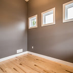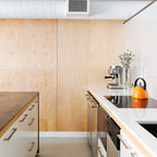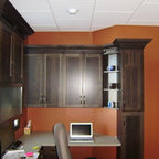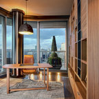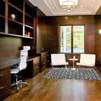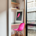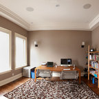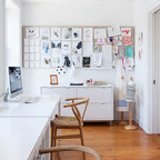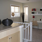 トロントのコンテンポラリースタイルのおしゃれなホームオフィス・仕事部屋 (白い壁、造り付け机、グレーの床) の写真 — Houzz