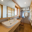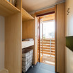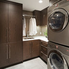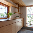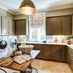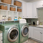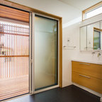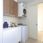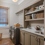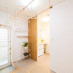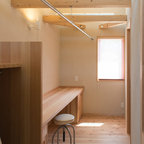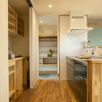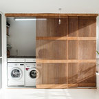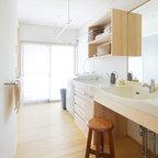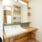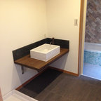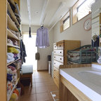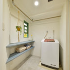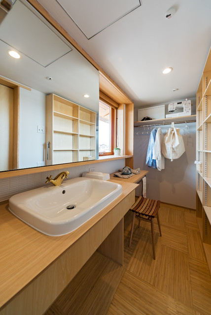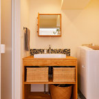 他の地域のアジアンスタイルのおしゃれな家事室 (ドロップインシンク、オープンシェルフ、淡色木目調キャビネット、木材カウンター、白い壁) の写真 — Houzz