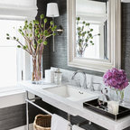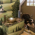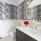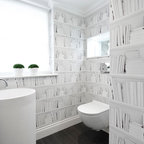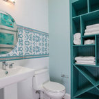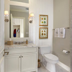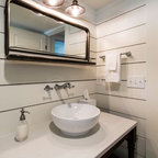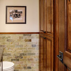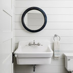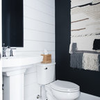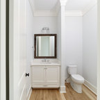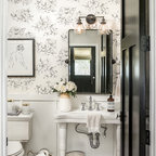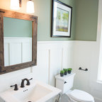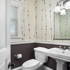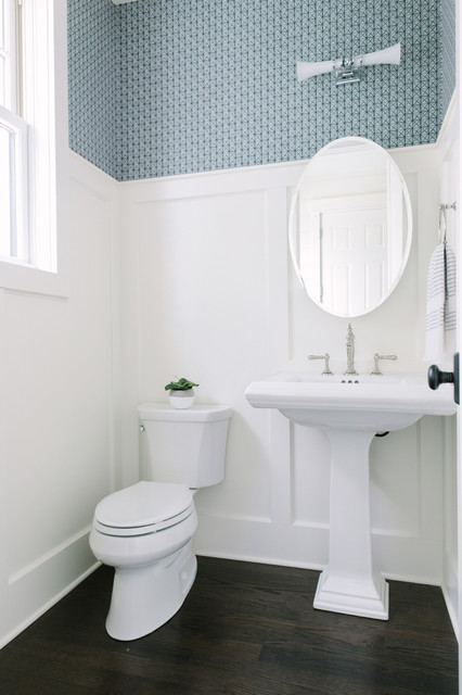 シカゴの中サイズのカントリー風おしゃれなトイレ・洗面所 (分離型トイレ、濃色無垢フローリング、ペデスタルシンク、茶色い床) の写真 — Houzz