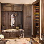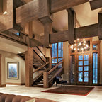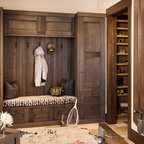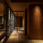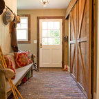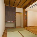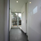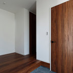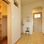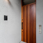 他の地域の片開きドアモダンスタイルのおしゃれな玄関ホール (白い壁、無垢フローリング、木目調のドア、茶色い床) の写真 — Houzz