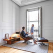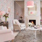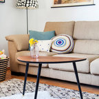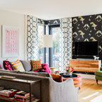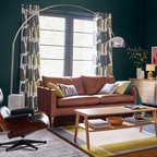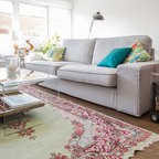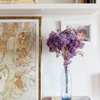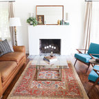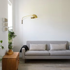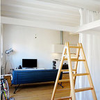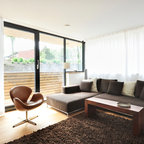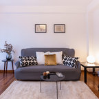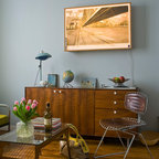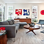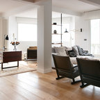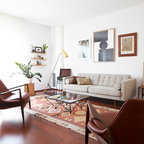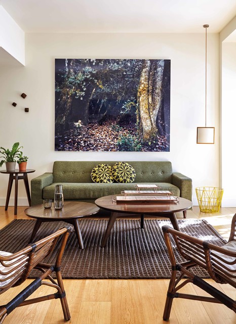 他の地域の中サイズのミッドセンチュリースタイルのおしゃれなLDK (白い壁、淡色無垢フローリング、フォーマル、暖炉なし、テレビなし) の写真 — Houzz