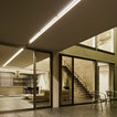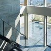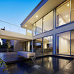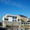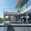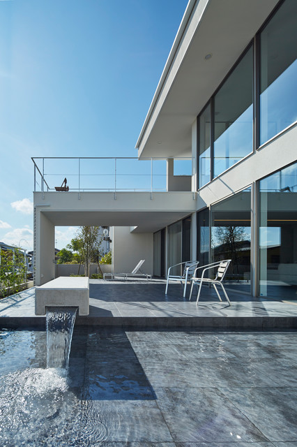 庇や2階のバルコニーなど立体的な構造がほかに例のない奥行きをもたらす。庇が直射日光を遮り、室内の温度を快適に保つ効果も。真夏は水盤が涼しげだ。