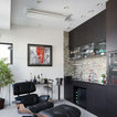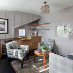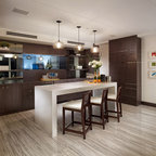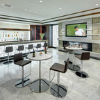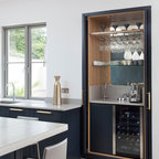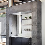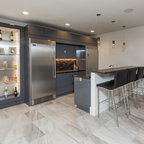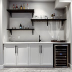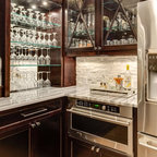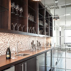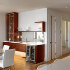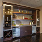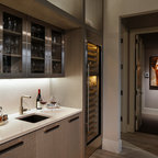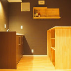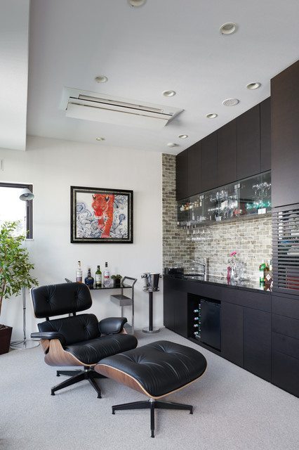 東京23区のコンテンポラリースタイルのおしゃれなウェットバー (フラットパネル扉のキャビネット、茶色いキャビネット、ベージュキッチンパネル、カーペット敷き) の写真 — Houzz